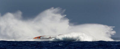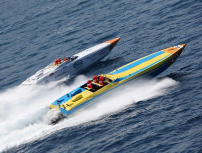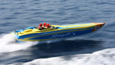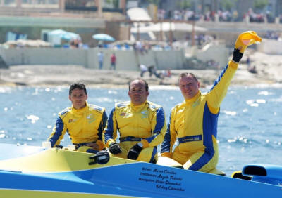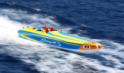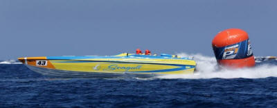 in their new supercharged Ukranian Seagull hull, romped home in just under